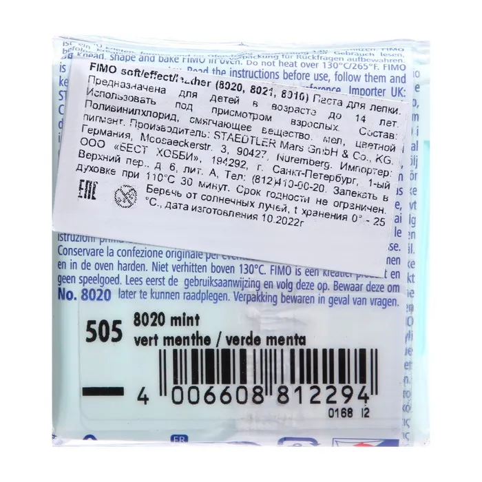 Полимерная глина FIMO Professional подходит для начинающих мастеров и професиональных художников.ОсобенностиМасса мягкая, поэтому вы легко придадите ей нужную форму.Цвета можно смешивать для получения необходимых оттенков, которые сохранятся после обжига.После запекания изделия становятся прочными и долговечными.Упаковка легко открывается без использования ножа. Если вы не полностью израсходовали блок, то остатки можно завернуть в упаковку — так глина лучше сохранится.Термическая обработка. Готовое изделие поместите внутрь духовки на тарелке, стекле или фольге. Запекайте при температуре 110 °С. Чем больше толщина элемента, тем дольше нужно запекать (вплоть до 30 минут). Температура обжига не должна пpeвышaть 130 °С.Пластика рекомендована для детей старше 8 лет.