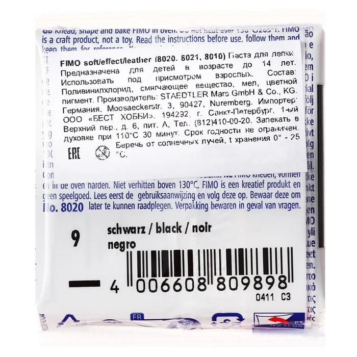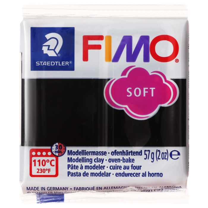 Полимерная глина FIMO подходит для начинающих мастеров и професиональных художников.ОсобенностиМасса мягкая, поэтому вы легко придадите ей нужную форму.Цвета можно смешивать для получения необходимых оттенков, которые сохранятся после обжига.После запекания изделия становятся прочными и долговечными.Упаковка легко открывается без использования ножа. Если вы не полностью израсходовали блок, то остатки можно завернуть в упаковку — так глина лучше сохранится.Термическая обработка. Готовое изделие поместите внутрь духовки на тарелке, стекле или фольге. Температура обжига не должна пpeвышaть 130 °С.Пластика рекомендована для детей старше 8 лет.