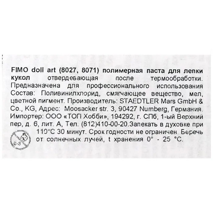Полимерная глина FIMO Professional подходит для начинающих мастеров и професиональных художников.ОсобенностиМасса мягкая, поэтому вы легко придадите ей нужную форму.Цвета можно смешивать для получения необходимых оттенков, которые сохранятся после обжига.После запекания изделия становятся прочными и долговечными.Упаковка легко открывается без использования ножа. Если вы не полностью израсходовали блок, то остатки можно завернуть в упаковку — так глина лучше сохранится.Термическая обработка. Готовое изделие поместите внутрь духовки на тарелке, стекле или фольге. Запекайте при температуре 110 °С. Чем больше толщина элемента, тем дольше нужно запекать (вплоть до 30 минут). Температура обжига не должна пpeвышaть 130 °С.Пластика рекомендована для детей старше 8 лет.