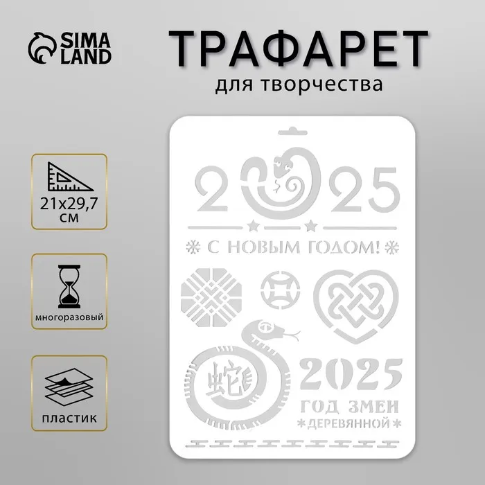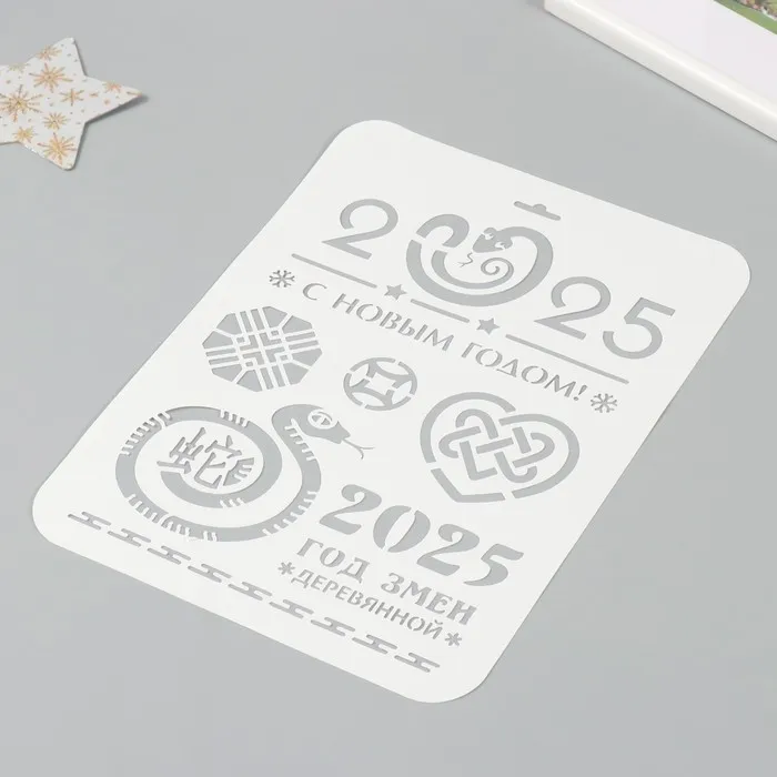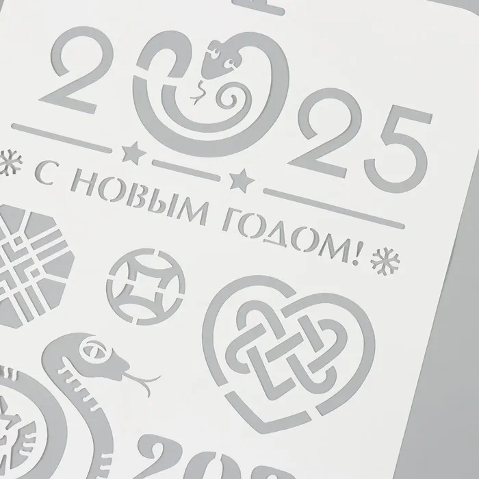 Пластиковый трафарет для творчества «С Новым годом 2025. Деревянная змея», шаблон, размер А4 — Характеристики