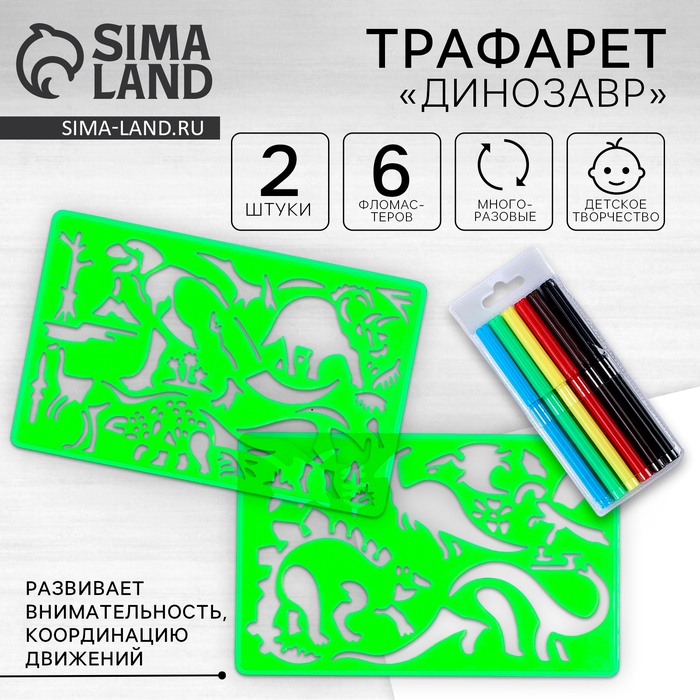 Трафареты «Динозавр», набор 2 шт., 6 шт. фломастеров