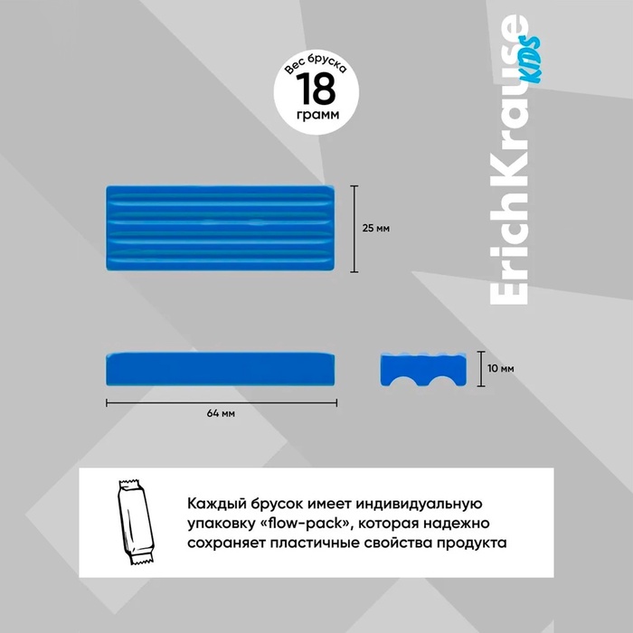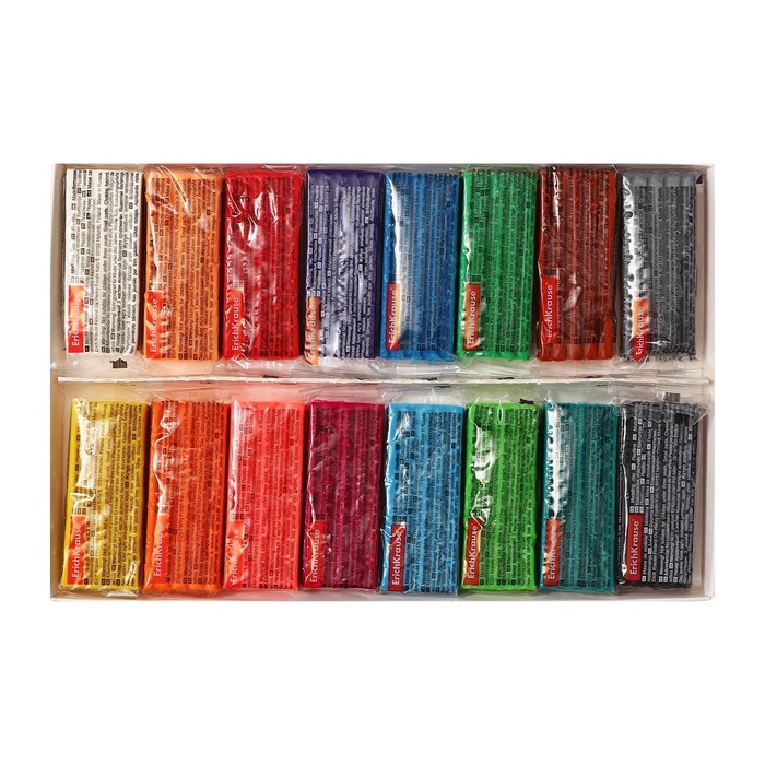 Палитра содержит яркие сочные цвета, которые отлично смешиваются между собой, создавая новые оттенки. Удлиненная форма бруска позволяет легко отделить необходимое количество пластилина для поделки. Каждый брусок имеет индивидуальную упаковку «flow-pack», которая надежно сохраняет товарный вид и пластичные свойства продукта. Обновленная эргономичная коробка-пенал с клапанами и поддон без коррекса удобна в использовании. В комплекте для декорирования и моделирования прилагается стек.