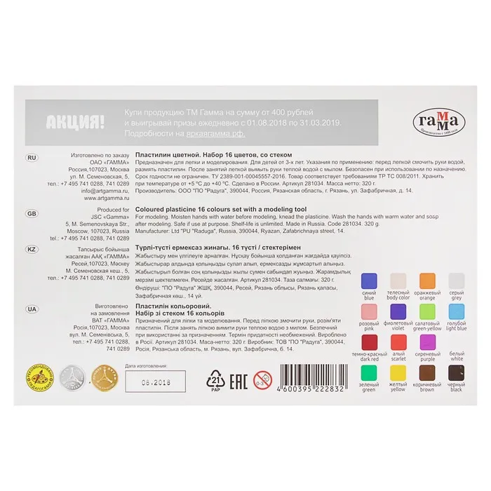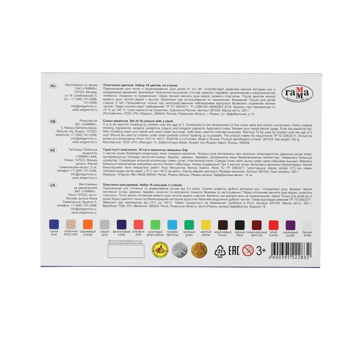 Пластилин 16 цветов 320 г, Гамма "Классический", со стеком, картонная упаковка 281034 — Характеристики