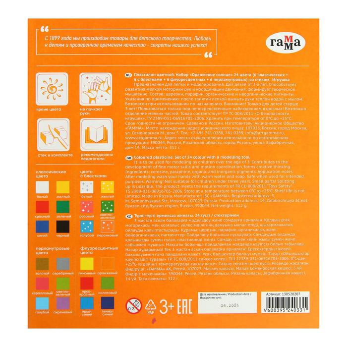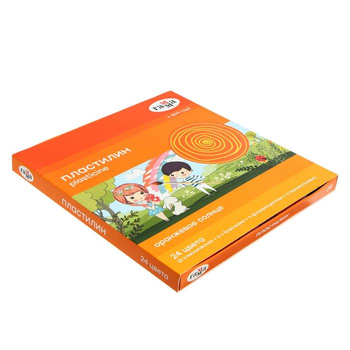 Пластилин 24 цвета 312 г (6 классических, 6 с блёстками, 6 перламутровых, 6 флуоресцентных) "Гамма" "Оранжевое солнце", со стеком