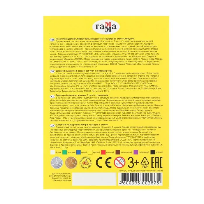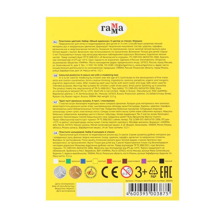 Пластилин 8 цветов 112 г "Юный художник", со стеком — Характеристики