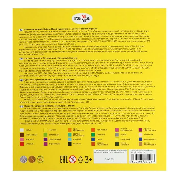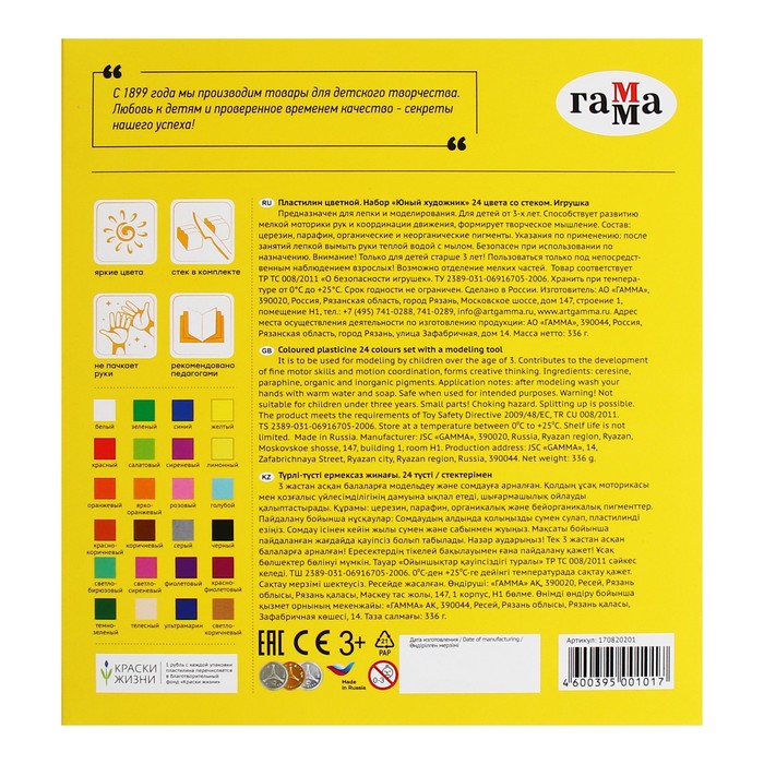Пластилин «Гамма. Юный художник», 24 цвета, 336 г, со стеком, картонная упаковка — Характеристики