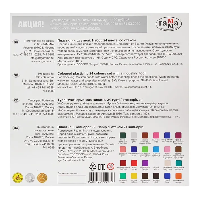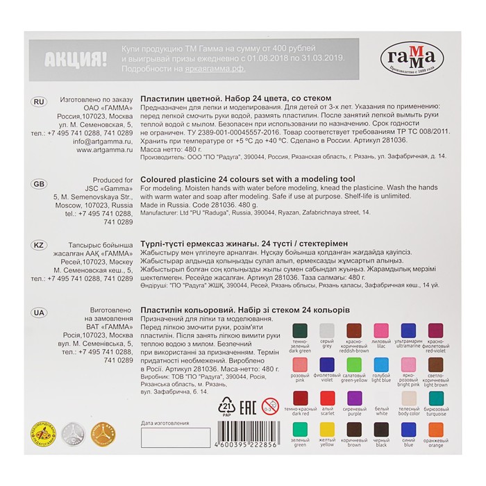 Пластилин «Гамма. Классический», 24 цвета, 480 г, со стеком — Характеристики