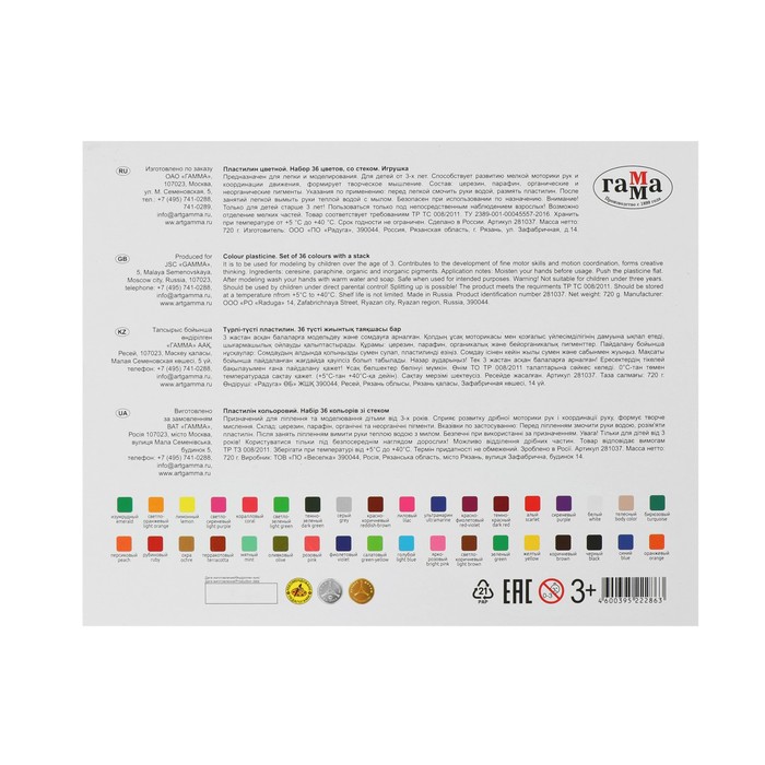 Пластилин «Гамма. Классический», 36 цветов, 720 г, со стеком — Характеристики