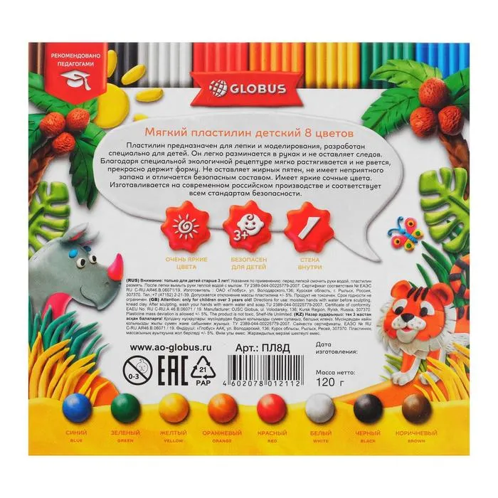 Пластилин GLOBUS «Детский», 8 цветов, 120 г, мягкий — Характеристики
