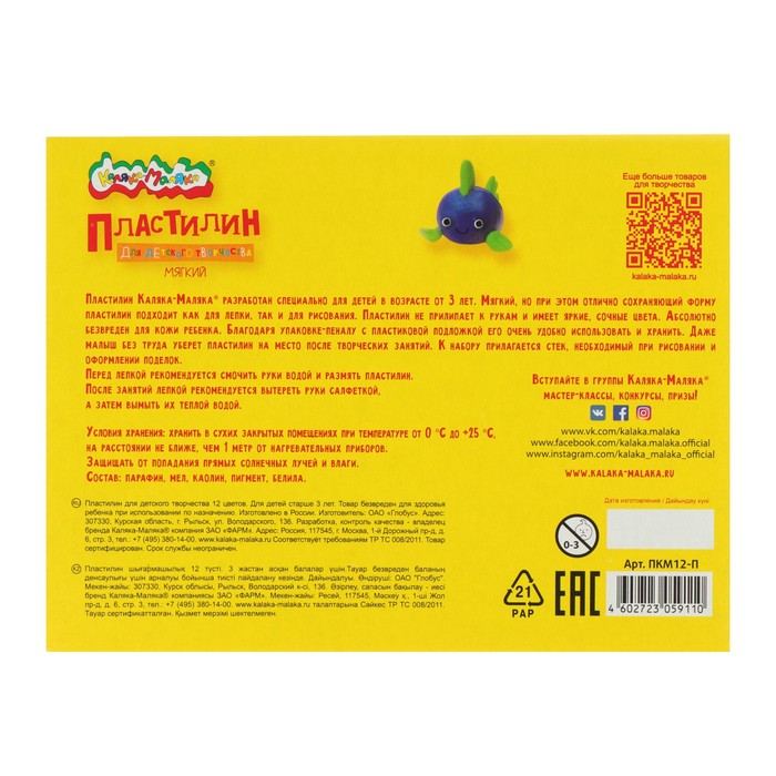 Пластилин «Каляка-Маляка», 12 цветов, 180 г, со стеком — Характеристики