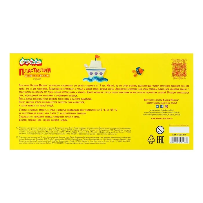 Пластилин «Каляка-Маляка», 18 цветов, 270 г, со стеком — Характеристики