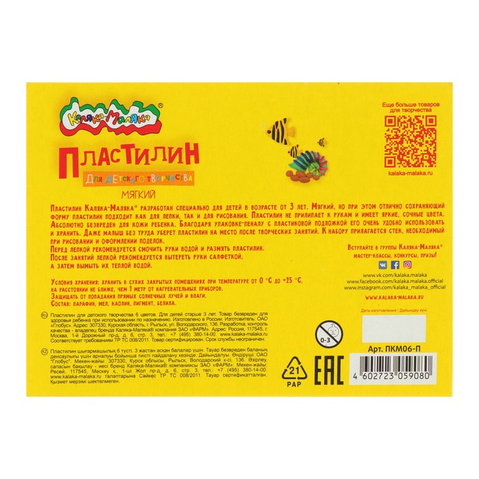 Пластилин «Каляка-Маляка», 6 цветов, 90 г, со стеком — Характеристики