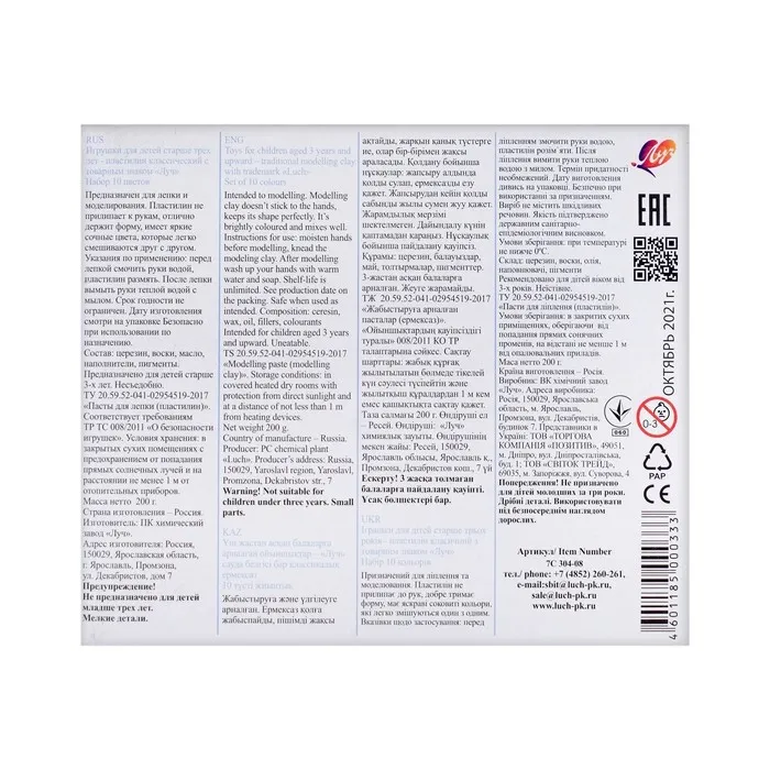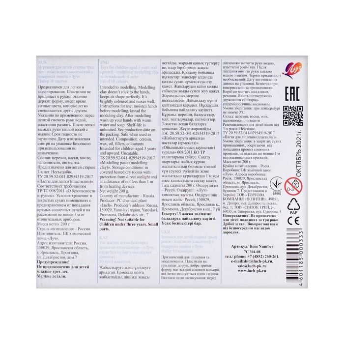 Пластилин «Луч. Классика цвета», 10 цветов, 200 г — Характеристики