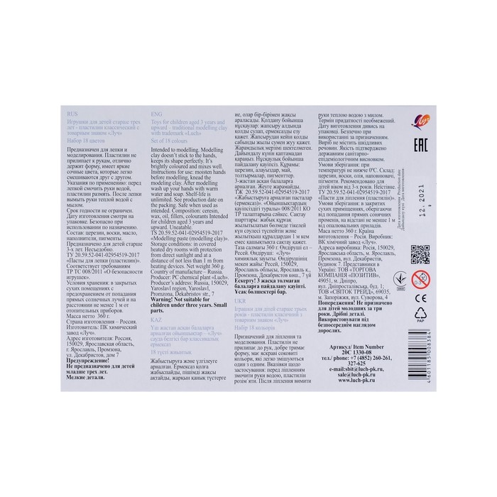 Пластилин «Луч. Классика цвета», 18 цветов, 360 г — Характеристики