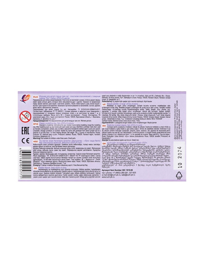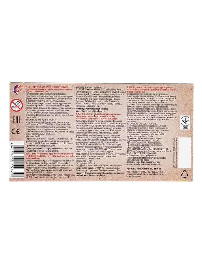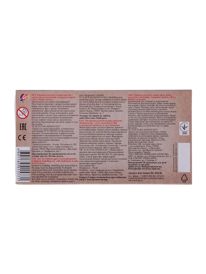 Хотите развивать мелкую моторику рук у ребенка? Торговая марка «Луч» разработала пластилин серии "Zoo", который изготовлен на основе природных восков. Пластилин не красит руки и не содержит вредных химических примесей в составе. Безопасность и качество подтверждается протоколами испытаний (испытания проходили в сертификационном центре Германии) (на упаковке знак CE).