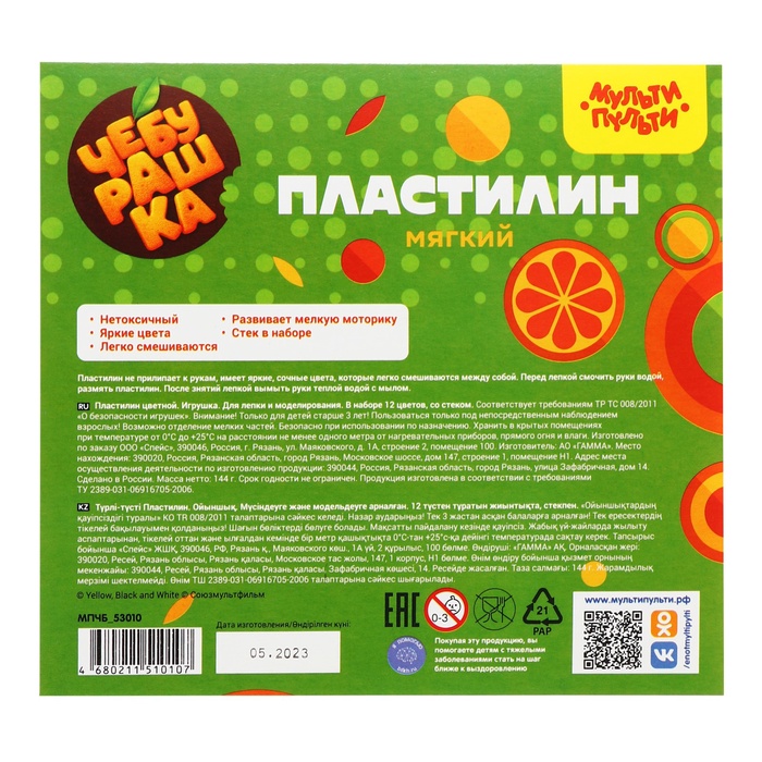 Пластилин Мульти-Пульти серии "Чебурашка" разработан для детей от 3 лет. Упаковка с любимым героем - Чебурашкой делает набор ярким и необычным. Специальная формула делает классический пластилин очень мягким. Благодаря небольшому весу бруска и меньшей толщине пластилин очень быстро набирает тепло от рук и становится пластичным. Маленьким детям с брусками небольшого размера проще работать (разогревать, разминать, резать на кусочки). Пластилин не липнет к рукам и не окрашивает их, хорошо держит форму поделки, не крошится при отрыве, из него можно создавать мельчайшие детали. 12 ярких цветов, которые прекрасно смешиваются и склеиваются друг с другом. Предназначен для изготовления поделок и аппликаций из пластилина. Вес бруска 12г. Общий вес: 144г.