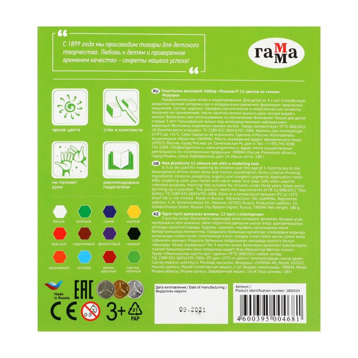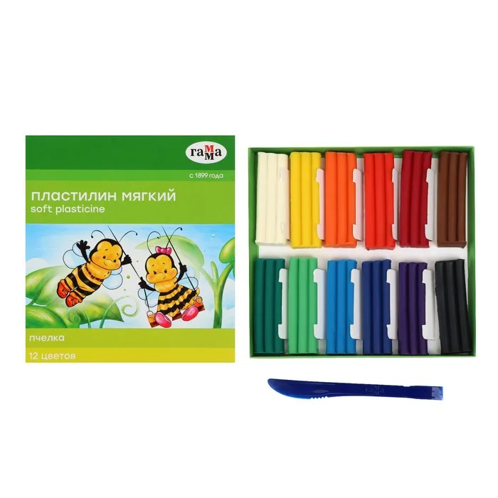 Пластилин мягкий (восковой) Гамма «Пчёлка», 12 цветов, 180 г, со стеком, картонная коробка — Характеристики