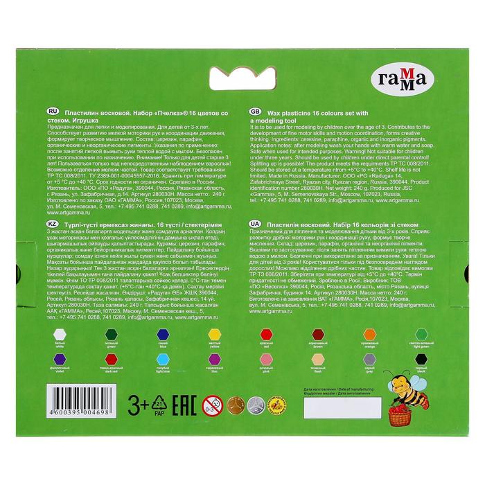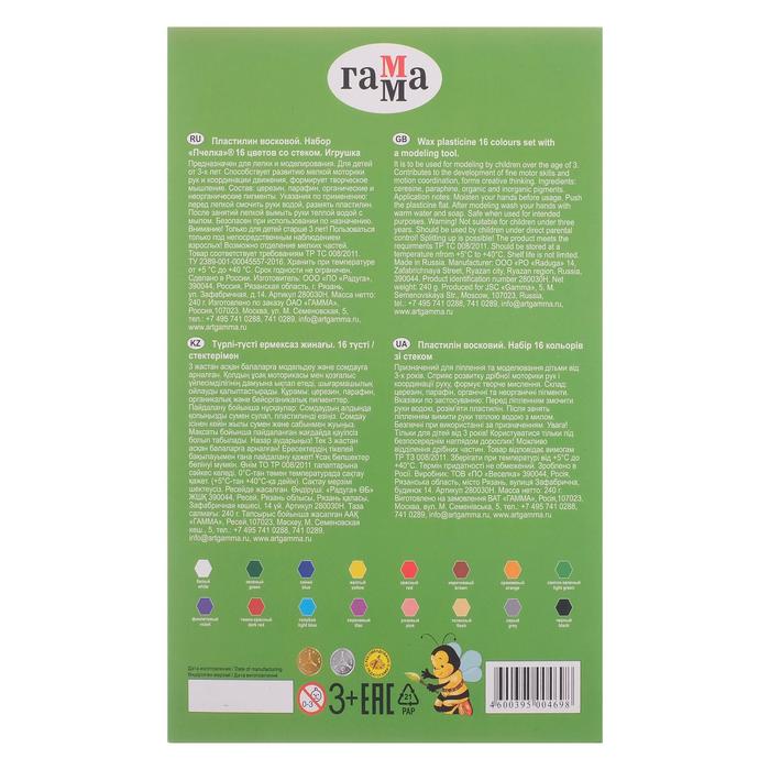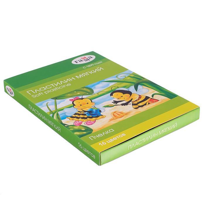 Пластилин мягкий (восковой) Гамма «Пчёлка», 16 цветов, 196 г, со стеком, картонная коробка — Характеристики