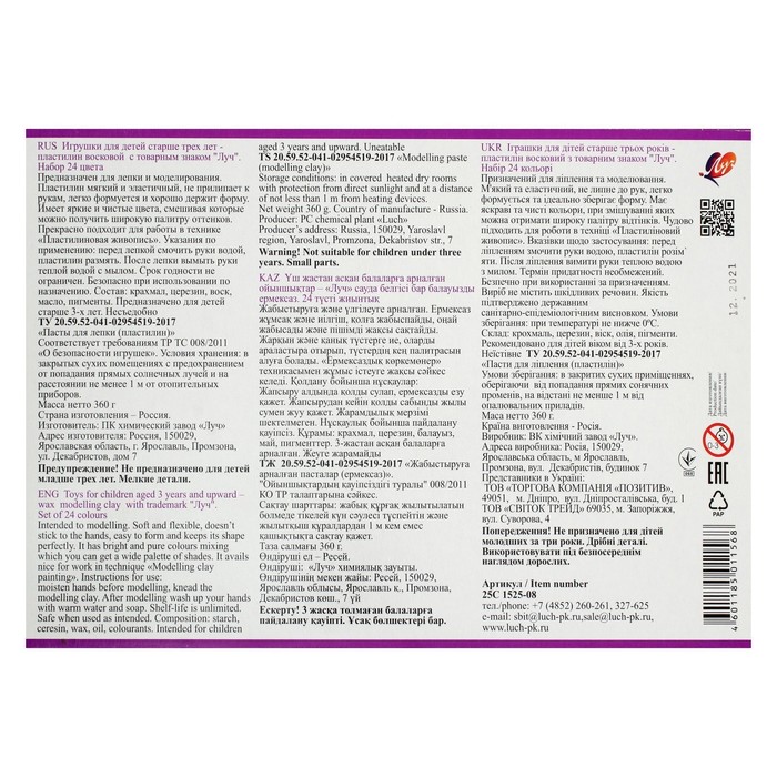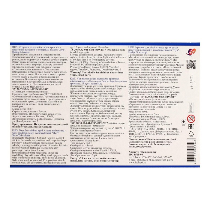 Пластилин мягкий (восковой) «Луч. Фантазия», 24 цвета, 360 г, со стеком, МИКС — Характеристики