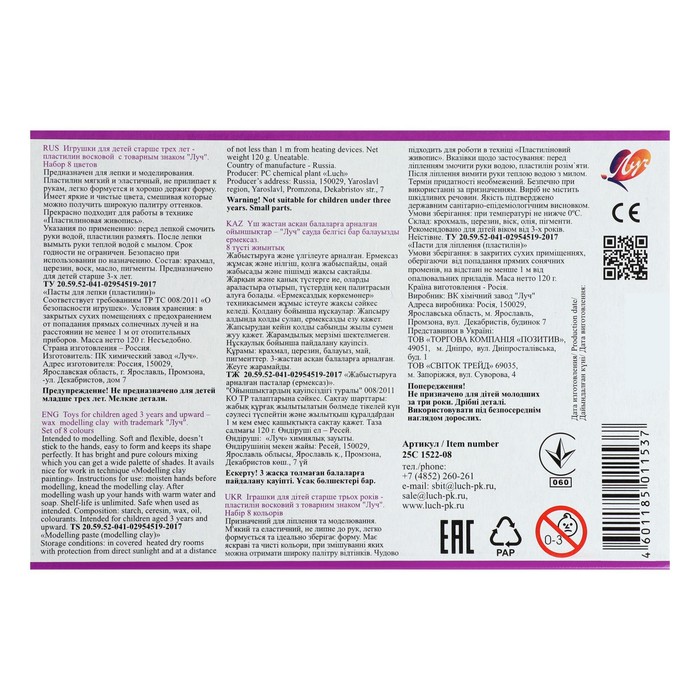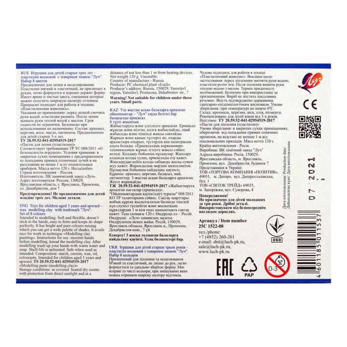 Пластилин мягкий (восковой) «Луч. Фантазия», 8 цветов, 140 г, со стеком, МИКС — Характеристики