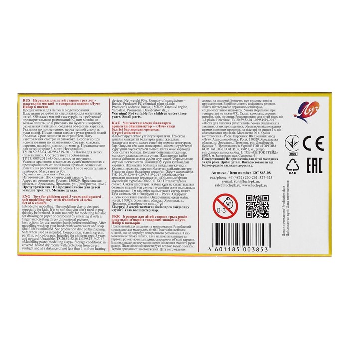 Пластилин мягкий (восковой) «Луч. Кроха», 6 цветов, 90 г, со стеком — Характеристики