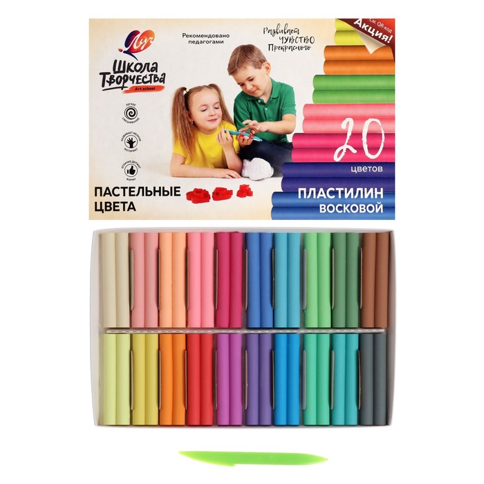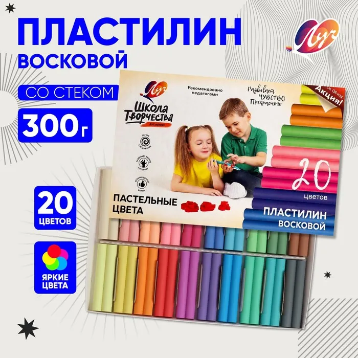 Пластилин мягкий (восковой) «Луч. Школа творчества», 20 цветов, 300 г, со стеком, МИКС — Характеристики