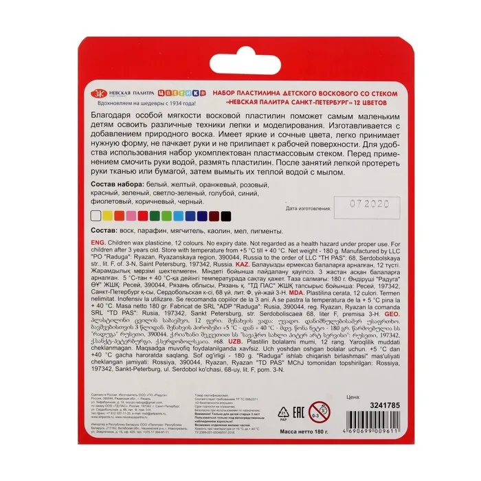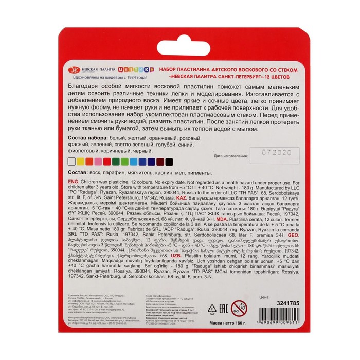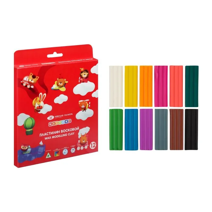 Набор пластилина воскового детского со стеком. Благодаря особой мягкости восковой пластилин поможет самым маленьким детям освоить различные техники лепки и моделирования. Изготавливается с добавлением природного воска. Имеет яркие и сочные цвета, легко принимает нужную форму, не пачкает руки и не прилипает к рабочей поверхности. Для удобства использования набор укомплектован пластмассовым стеком. Перед применением смочить руки теплой водой. После занятий лепкой протереть руки тканью или бумагой, затем вымыть их теплой водой с мылом.