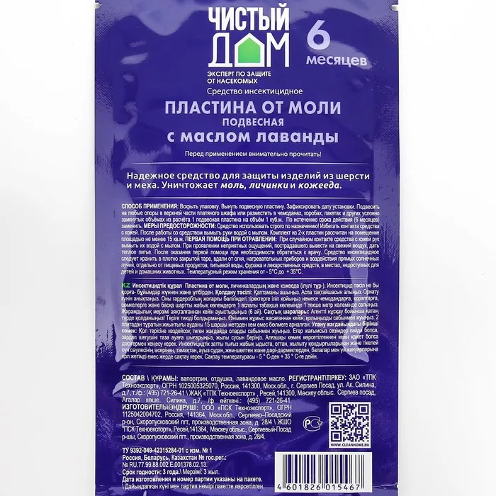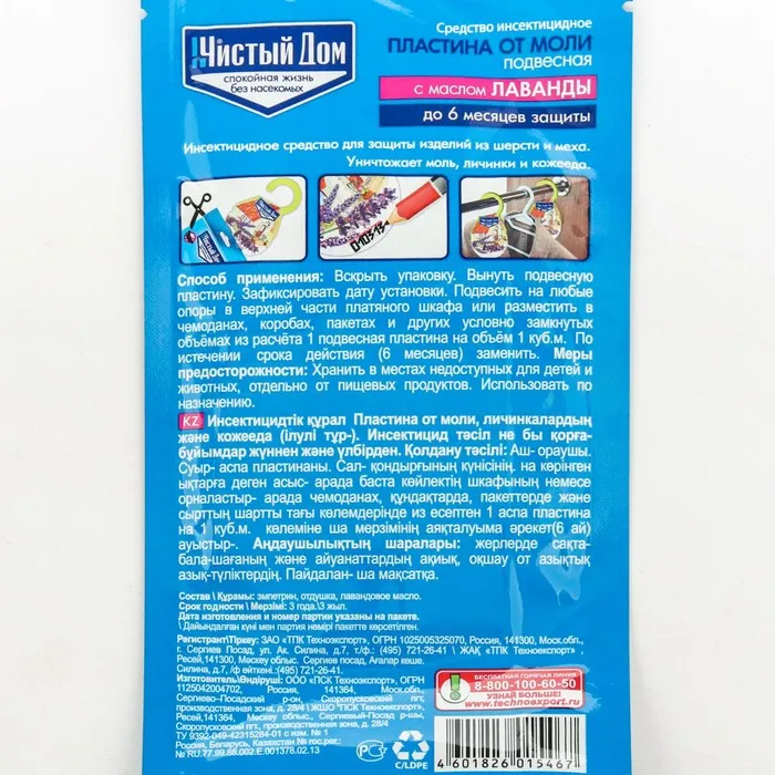 Чистый Дом Пластина от моли подвесная с маслом лаванды - средство инсектицидное представляет собой картонную пластину белого цвета, с запахом лаванды, размером 2х3 см, помещённую в полиэтиленовый пакет. Средство предназначено для уничтожения моли на объектах различного назначения: жилые, производственные, складские помещения специалистами организаций, имеющих право заниматься дезинфекционной деятельностью и населением в быту.