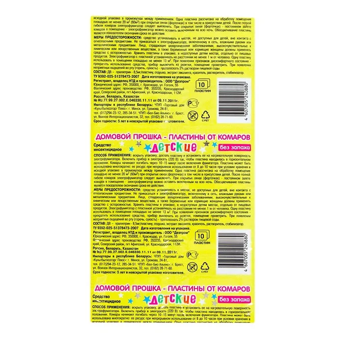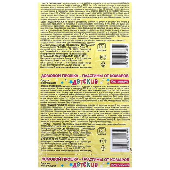 Описание: пластины для уничтожения комаров в помещениях в присутствии детей любого возраста.Способ применения: устанавливаются в любой фумигатор, комары начинают погибать через 10-15 минут после включения фумигатора, ресурс непрерывного использования пластины - 8-10 часов, одна пластина обрабатывает помещение до 20 кв. м. при открытых окнах.Состав: ДВ - праллетрин, 10 мг/пластину, отдушка, краситель, растворитель.Форма выпуска: 10 пластин в герметичной полимерной упаковке.Срок годности: 3 года в невскрытой упаковке производителя.