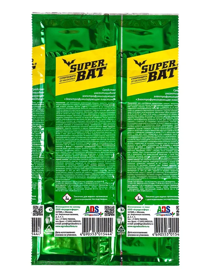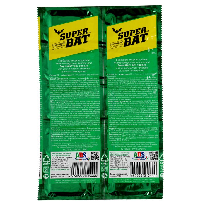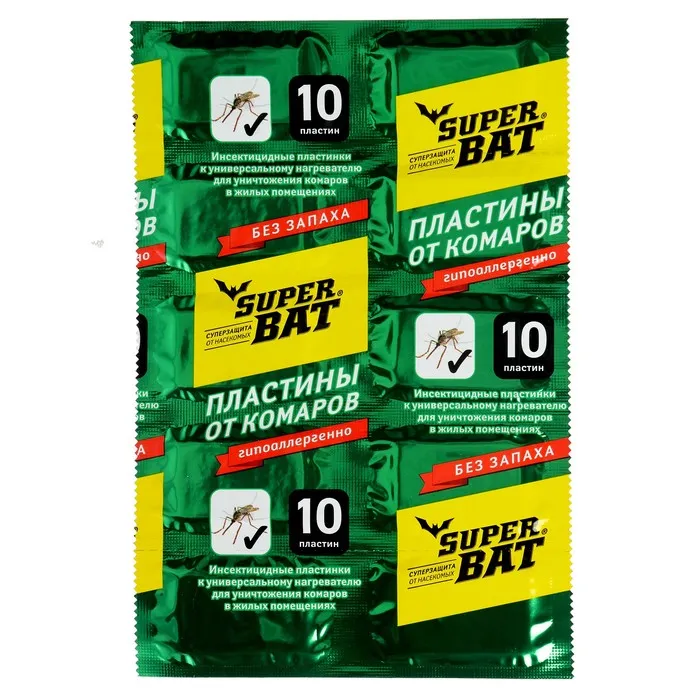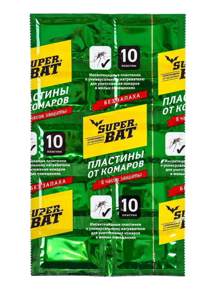 Средство инсектицидное "Пластины от комаров без запаха". Используется с универсальным электрофумигатором SuperBAT. Полное уничтожение комаров в закрытом помещении достигается, примерно, за 1 час. Одна пластина рассчитана на работу в течение 8-9 часов. При открытых форточках или окнах электрофумигатор с пластиной можно оставить включенным на всю ночь для уничтожения насекомых, залетающих в помещение.Способ применения: извлечь из упаковки пластину, поместить её на нагревательную поверхность электрофумигатора, включить его в электросеть (220 В). Средство начинает действовать через 10-15 минут после включения. Полное уничтожение комаров достигается примерно за 1 час. При открытых окнах или форточках электрофумигатор с пластиной можно оставить включенным на всю ночь для уничтожения насекомых, залетающих в помещение. После окончания работы электрофумигатор выключают, пластину сохраняют до следующего использования. Одна пластина рассчитана на работу в течение 8-9 часов. Замену пластины следует проводить, отключив электрофумигатор от электросети.Состав: ДВ - эсбиотрин (15 мг/пластину), растворитель, краситель.