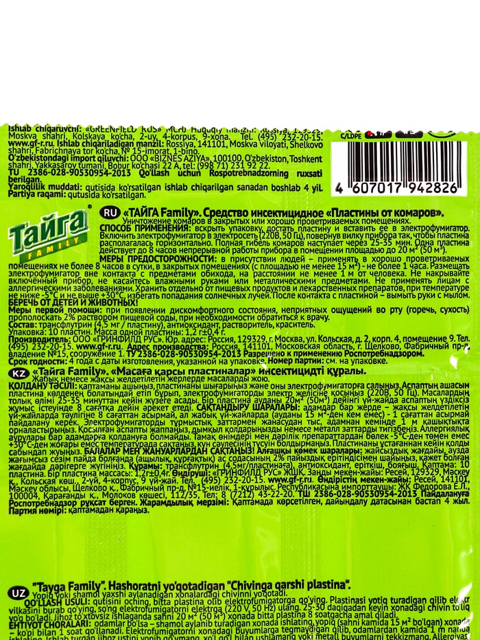 Пластины от комаров Тайга Family, инсектицидные, 10 шт — Характеристики