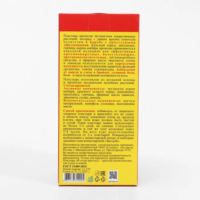 Пластырь пропитан экстрактами лекарственных растений, которые с давних времён помогали целителям в борьбе с простудными заболеваниями. Красный перец, шиповник, горчица, корень имбиря, прополис применяются в народной медицине как эффективные противовирусные, болеутоляющие, противовоспалительные, антимикробные средства, а эфирные масла эвкалипта, сосны и лаванды используются для укрепления иммунитета, восстановления защитных функций организма, снятия температуры, избавления от кашля и слизи в бронхах, головной боли, боли в горле и снижения заложенности носа.