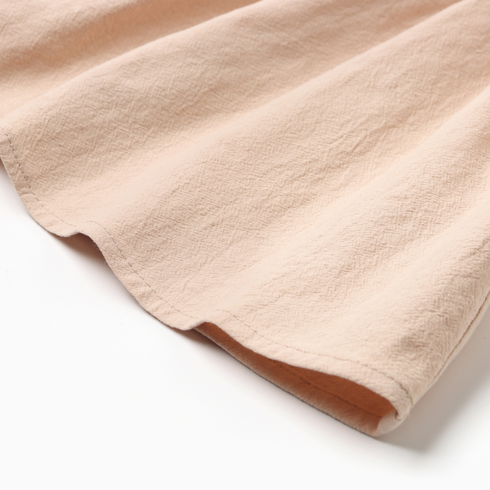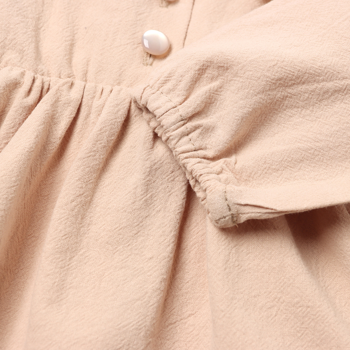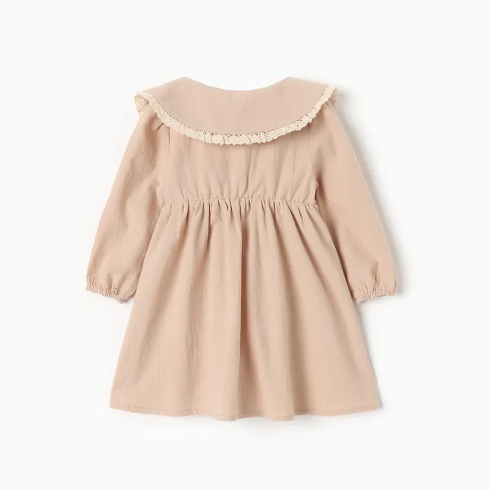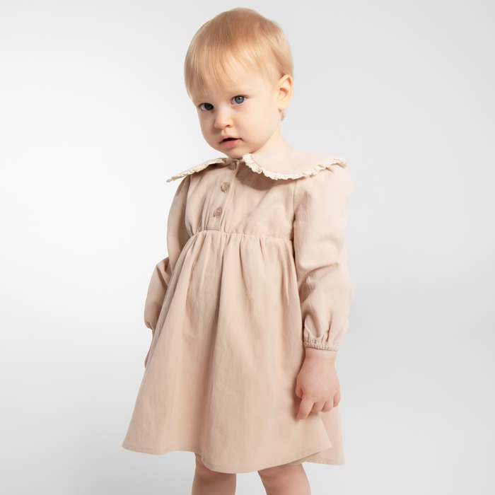 Летнее платье для девочки в нежном бежевом цвете создано из хлопковой ткани, которая отлично подходит для тёплых дней. Свободный покрой и классическая длина до колен делают изделие комфортным для активных игр и прогулок. Воротник и длинный рукав добавляют функциональности и аккуратности образу, а однотонный дизайн в сочетании с клёш-юбкой подчеркивают естественную простоту и элегантность.