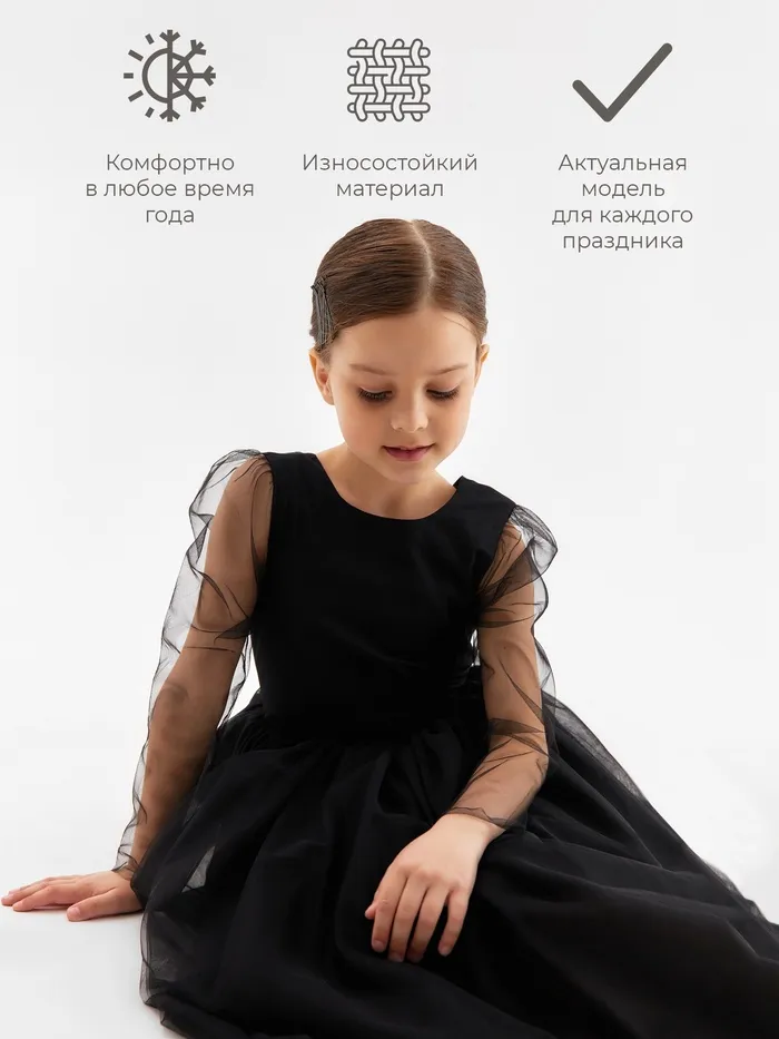 Детское нарядное платье для особых случаев. Расклешённый силуэт и пышная юбка создают элегантный образ. Выполнено из гипюра и фатина с подкладом из хлопка и полиэстера. Мягкие ткани и комфортная посадка обеспечивают удобство. Эластичные вставки и застёжка-молния облегчают надевание. Чёрный цвет придаёт утончённость и позволяет легко сочетать с различными аксессуарами. Идеально для праздников, утренников, фотосессий и семейных торжеств.