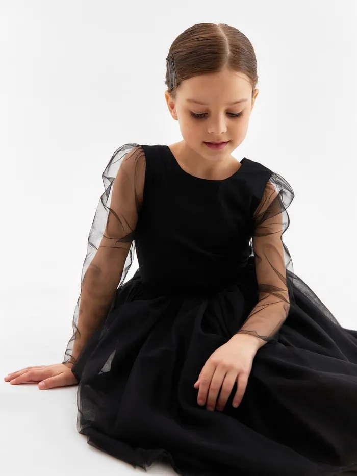 Нарядное детское платье для особых случаев. Расклешённый силуэт и пышная юбка создают элегантный образ. Застёжка на спинке обеспечивает удобство при надевании. Материал – высококачественный полиэстер с мягкой подкладкой. Чёрный цвет подчёркивает стильность и универсальность модели. Идеально для праздников, утренников и фотосессий. Комфортная посадка, не сковывает движений. Устойчиво к стирке – сохраняет форму и внешний вид.