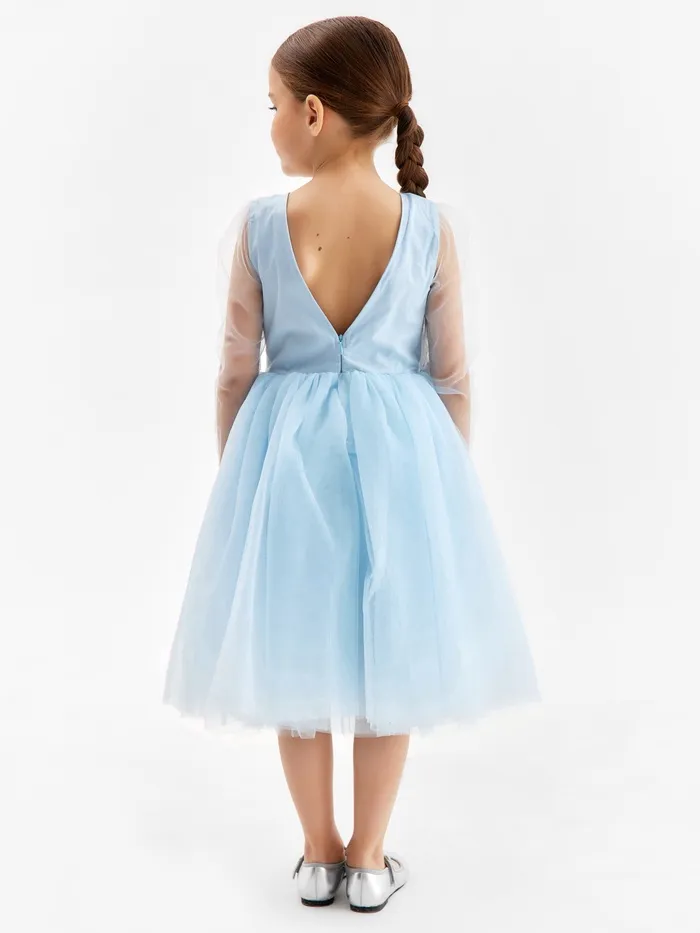 Нарядное детское платье для праздников и особых случаев. Расклешённая юбка и завышенная талия создают изящный силуэт. Лёгкая и дышащая ткань обеспечивает комфорт, а аккуратные швы не вызывают раздражения. Застёжка-молния или пуговицы делают надевание удобным. Голубой цвет придаёт образу нежность, а декоративные элементы, такие как банты и рюши, добавляют элегантности. Подходит для утренников, фотосессий и торжественных мероприятий.
