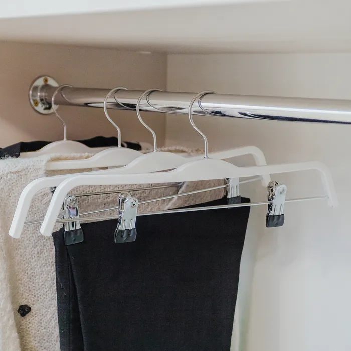 Вешалка – это компактное приспособление, которое позволит вам разместить в гардеробе классические штаны из лёгких или плотных материалов, блузки, рубашки, кофты и другие вещи. Изделие практичной формы занимает мало места, что позволяет экономить пространство в шкафу. Противоскользящее покрытие надёжно зафиксирует одежду и предотвратит её падение.