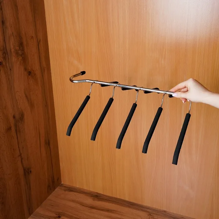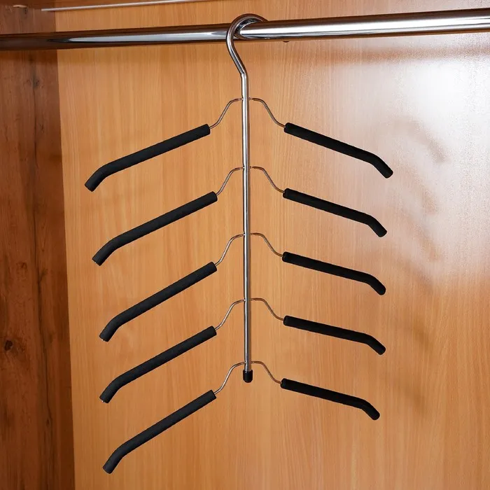 Вешалка – это компактное приспособление, которое позволит вам разместить в гардеробе классические штаны из лёгких или плотных материалов, блузки, рубашки, кофты и другие вещи. Изделие практичной формы занимает мало места, что позволяет экономить пространство в шкафу. Эргономичная форма поможет надёжно зафиксировать одежду и предотвратить её падение.