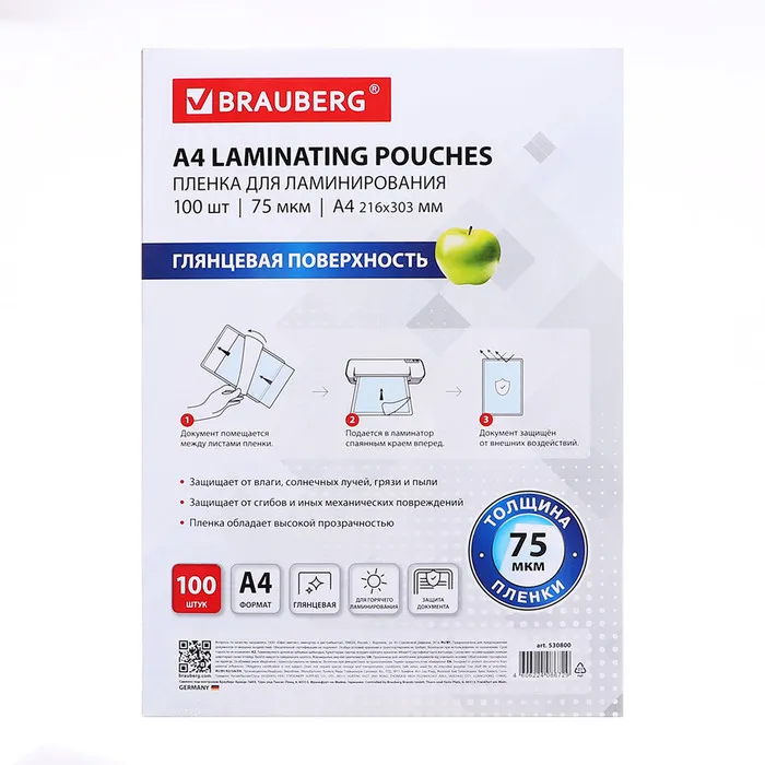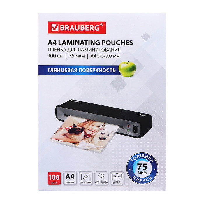 Пленка для ламинирования BRAUBERG надежно защитит документы от влаги, пыли, воздействия УФ-лучей и других внешних факторов. Представляет собой двойной пакет, спаянный с одной стороны (содержание полиэстера > 50%). Документ вкладывается между слоями пленки и в дальнейшем подвергается термообработке в ламинаторе. Суммарная толщина пленки-заготовки - 150 (75х2) мкм, что позволяет защитить документы и увеличить жесткость, сохраняя яркость изображения. Пленка для ламинирования BRAUBERG формата А4 (216х303 мм) имеет уникальный состав: полиэтилентерефталат (PET), этиленвинилацетат (EVA), полиэтилен (LDPE). Промежуточный слой полиэтилена (LDPE) выступает как связующий элемент между слоями PET и EVA, служит дополнительной защитой от вероятного вытекания клея из-под пленки при ламинировании. Полиэтилен (PE) придает пакетам прочность эластичность и износостойкость. Глянцевое покрытие пленки способствует сохранению и максимальной передаче цвета ламинируемого изображения. Поставляется в картонной упаковке по 100 штук, которых при нечастом использовании хватает на продолжительное время.