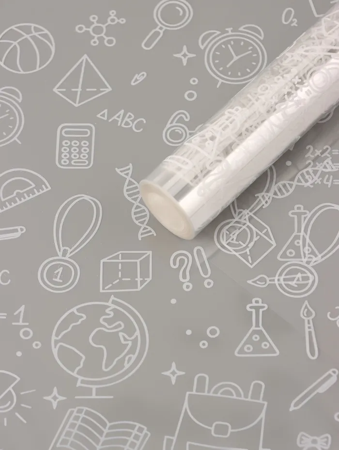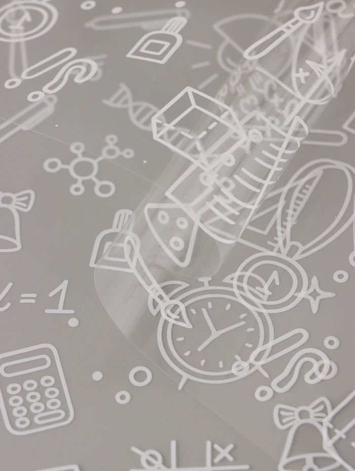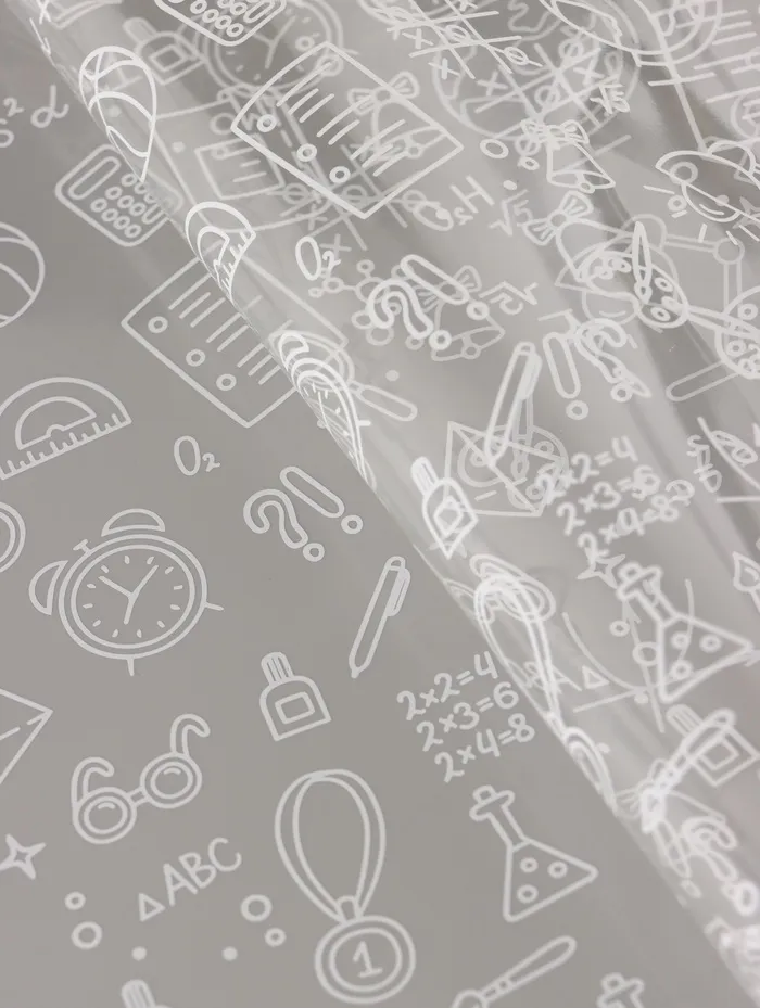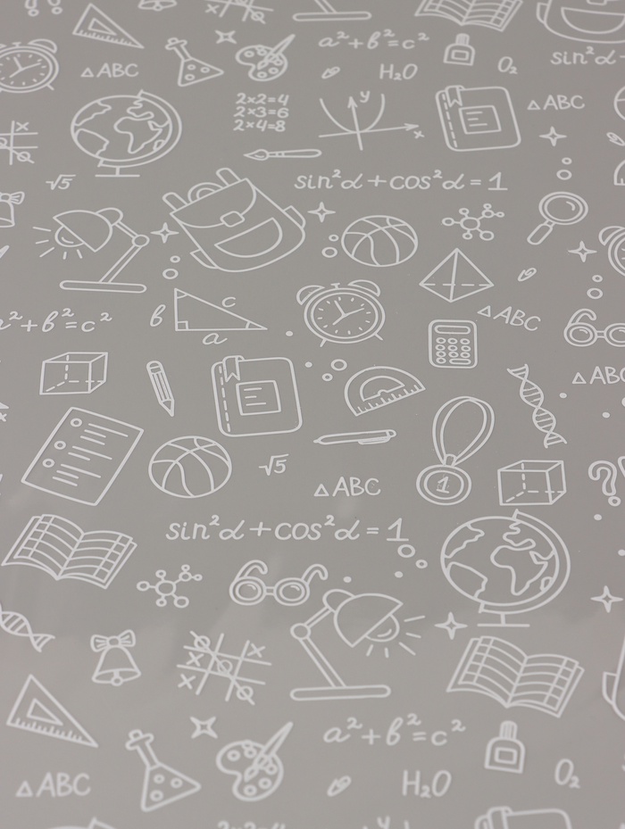 - Четкий школьный принт: На прозрачную пленку нанесены белые надписи, цифры и буквы. Узор сразу создает нужное настроение для событий, связанных с учебой.