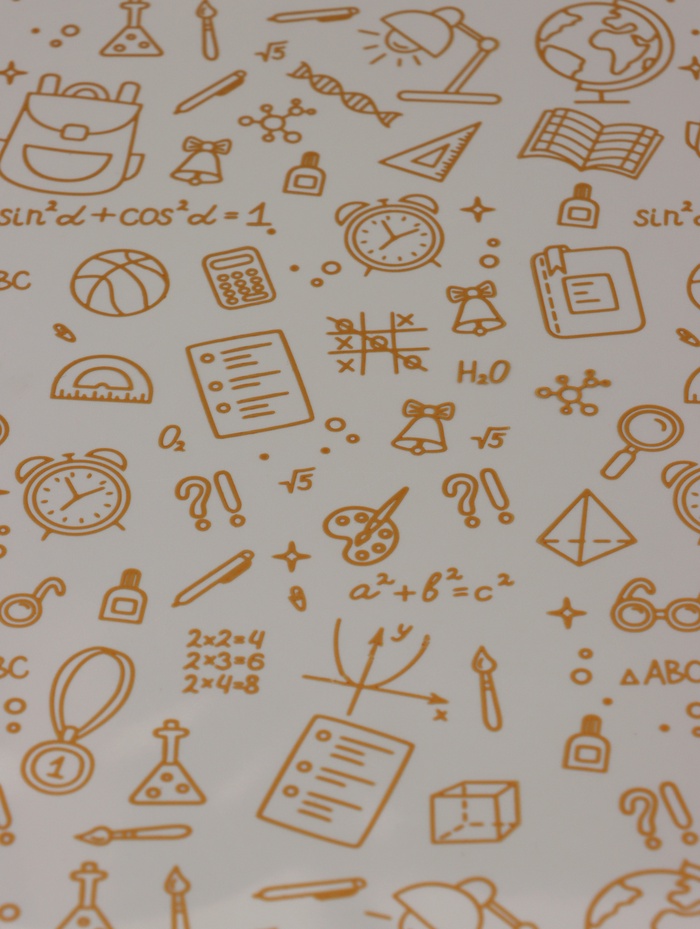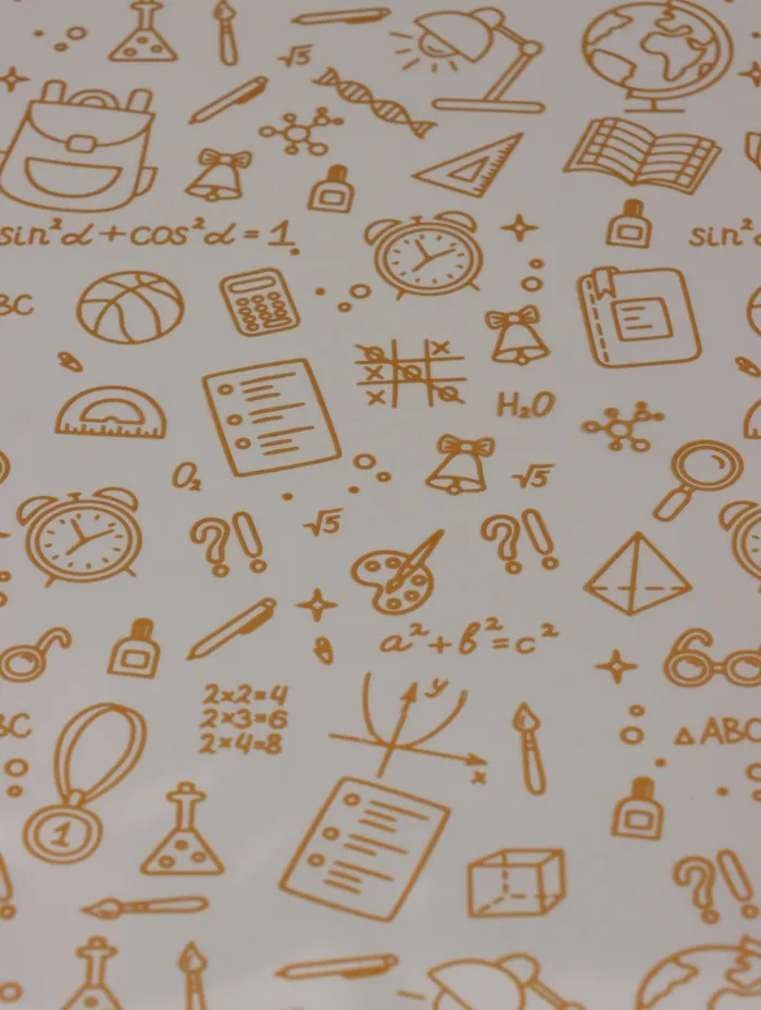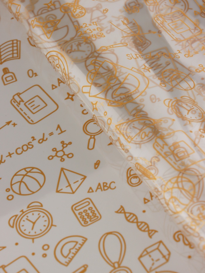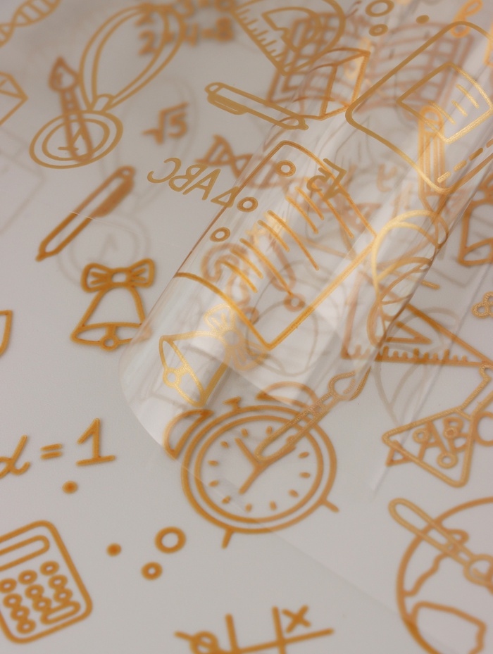 - Золотой школьный узор: На прозрачную пленку нанесены золотистые надписи, цифры и символы школы. Рисунок выглядит нарядно и подходит для торжественных событий.