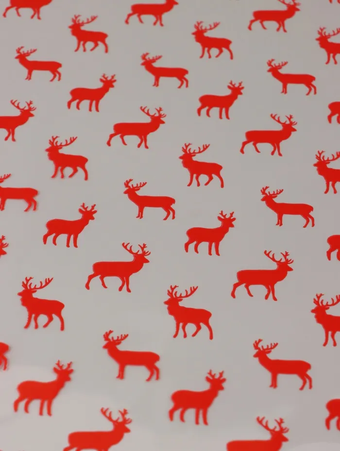 - Контрастный новогодний рисунок: На красном глянцевом фоне выделяются прозрачные силуэты северных оленей и зимние узоры. Сочетание создает динамичный и праздничный эффект.