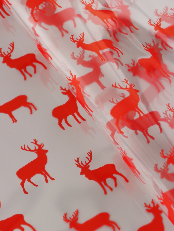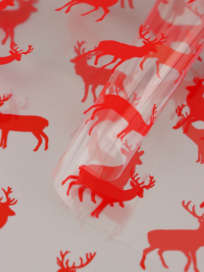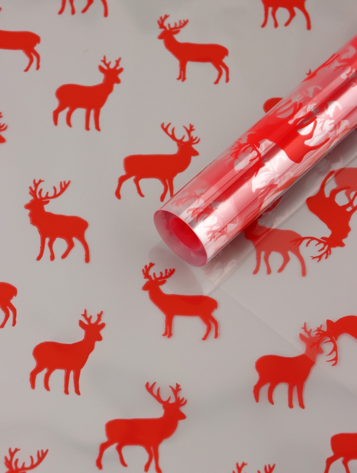 Яркий акцент новогоднего подарка! Пленка упаковочная «Северные олени» красная — это глянцевая пленка с праздничным рисунком для оформления подарков. Красный фон с прозрачными узорами создает насыщенный цвет и сохраняет видимость содержимого.