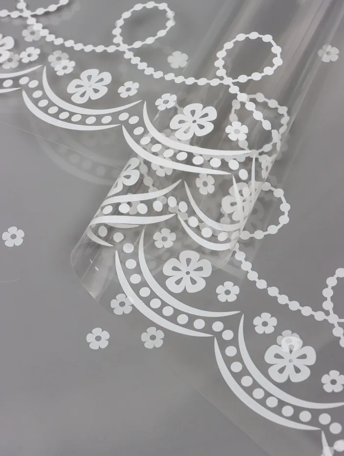 - Элегантный дизайн: Белый рисунок с мотивами цветочных узоров добавляет утонченности любой обстановке. Прозрачная база плёнки придает легкость и воздушность любому декору.