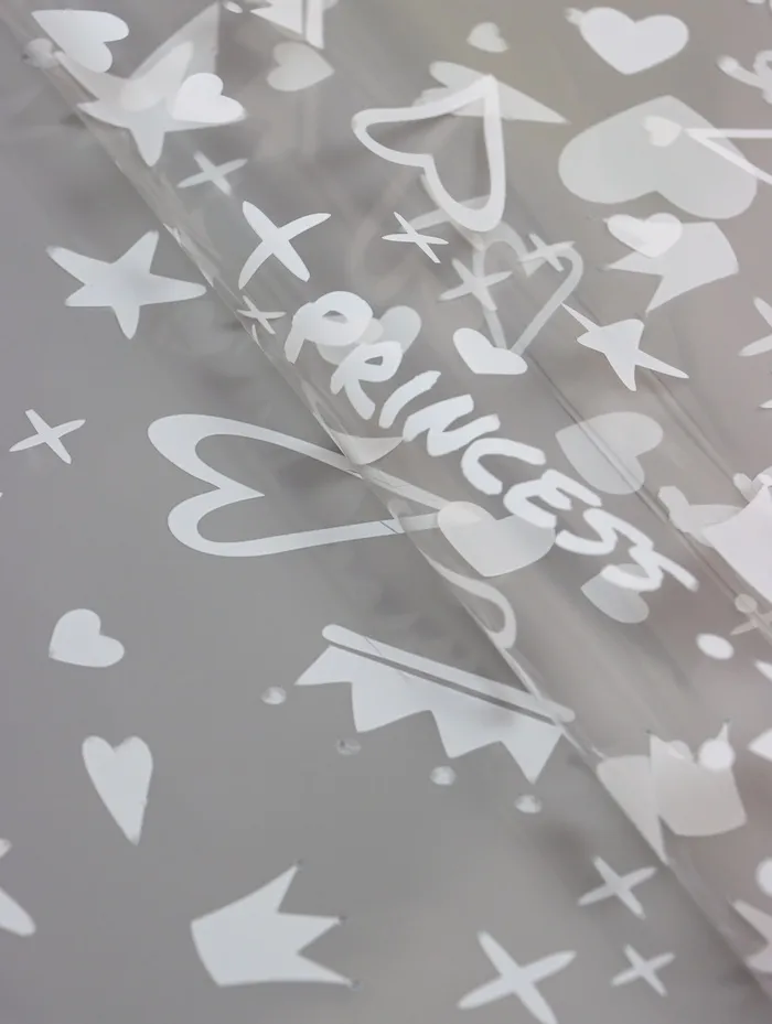 Элегантное оформление для вашего праздника! Декоративная прозрачная плёнка «Принцесса» с белым рисунком добавит изысканный штрих вашей декорации. Она подходит для разнообразных торжеств, создавая атмосферу праздника.
