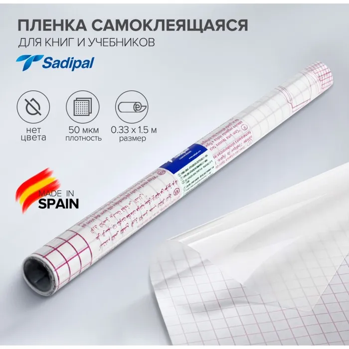 Пленка самоклеящаяся прозрачная бесцветная для книг и учебников, ОТКЛЕИВАЕМАЯ, 0.33 х 1.5 м, 50 мкм, Sadipal — Характеристики