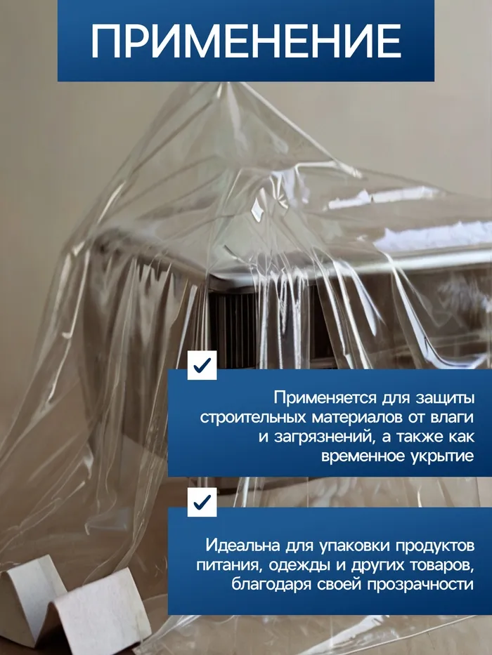 Плёнка применяется для укрытия растений от заморозков и защиты любых предметов от пыли и осадков. Она производится из первичного полиэтилена в виде специального рукава, который при необходимости можно разрезать. В состав полиэтилена входят специальный УФ-стабилизатор, который не даёт ей разрушаться под действием солнечных лучей.
