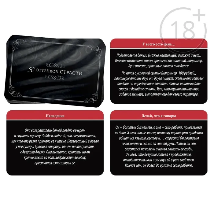 Хотите ещё больше новых эмоций? Перед вами игра, разжигающая огонь желания. Вы сможете доставить друг другу незабываемое удовольствие и окунуться с головой в мир фантазии.