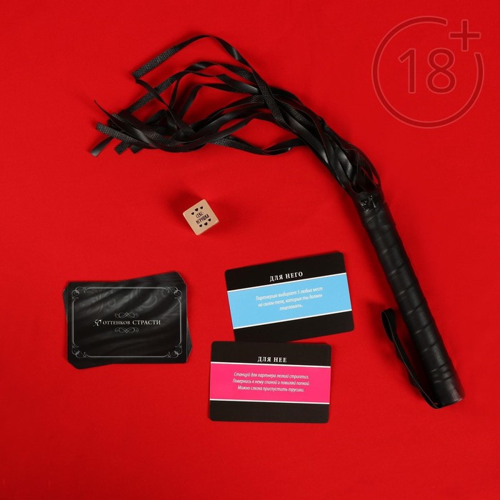 В комплекте есть плётка. Используйте её по назначению, чтобы добавить игре перчинки! Также внутри есть кубик с действиями. По очереди бросайте его и выполняйте то, что указано на выпавшей грани.
