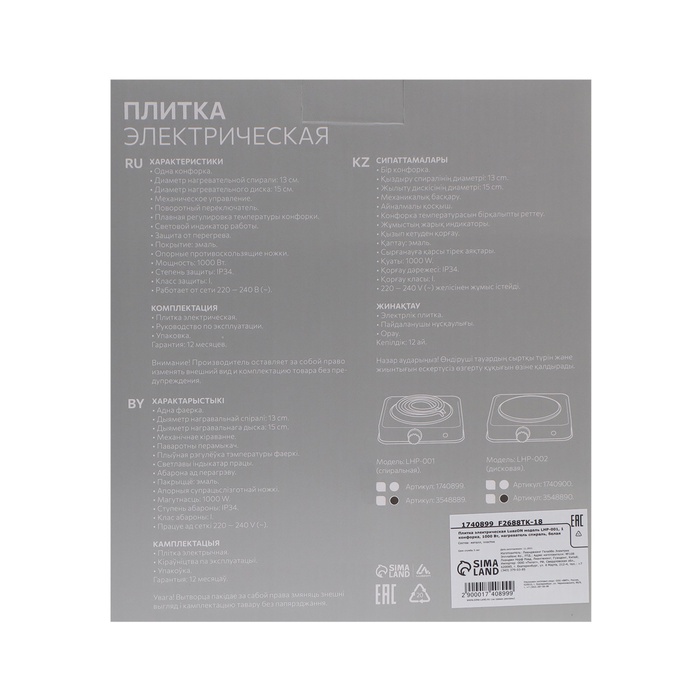 Плитка электрическая Luazon LHP-001, 1 конфорка, 1000 Вт, нагреватель спираль, белая — Характеристики